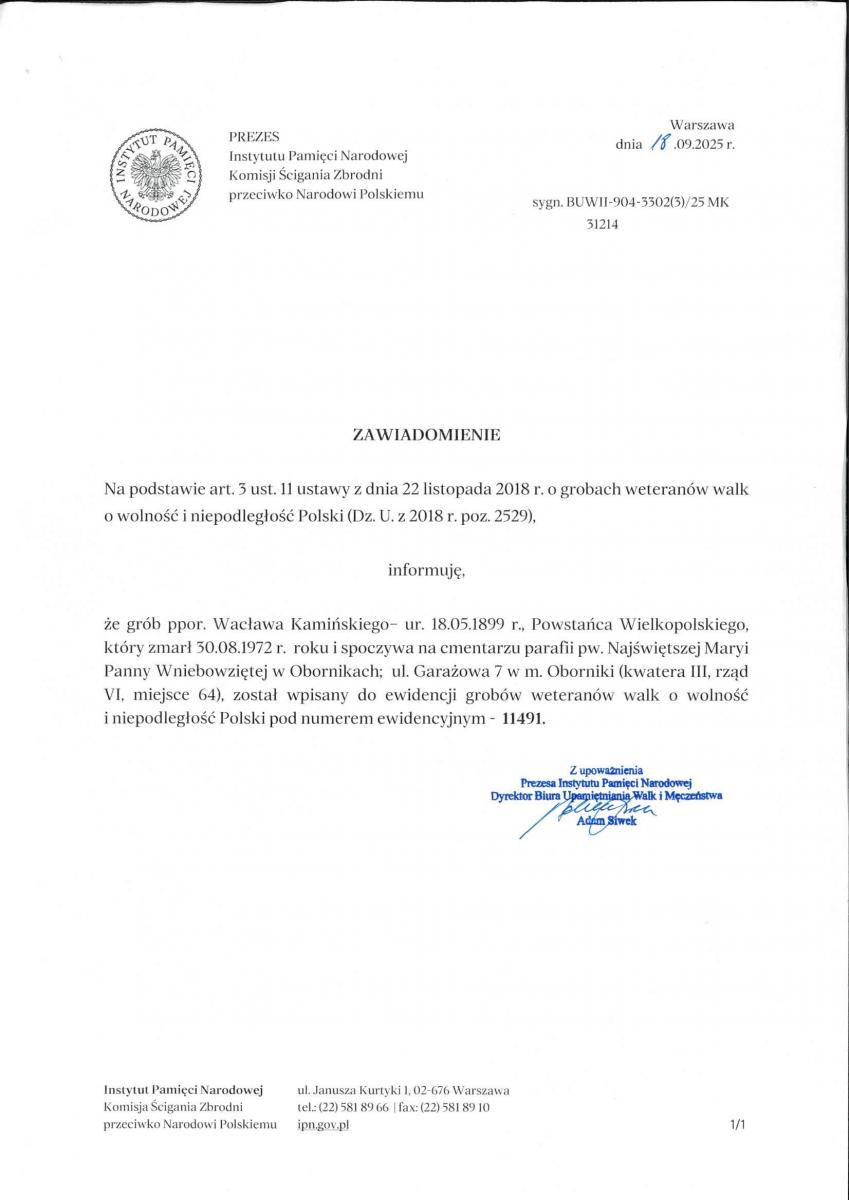 Wacław Kamiński pomimo odniesionych ran w czasie I wojny światowej zgłosił się jako ochotnik do służby powstańczej i brał czynny udział z bronią w ręku w bojach przy oswobodzeniu Poznania i Obornik.