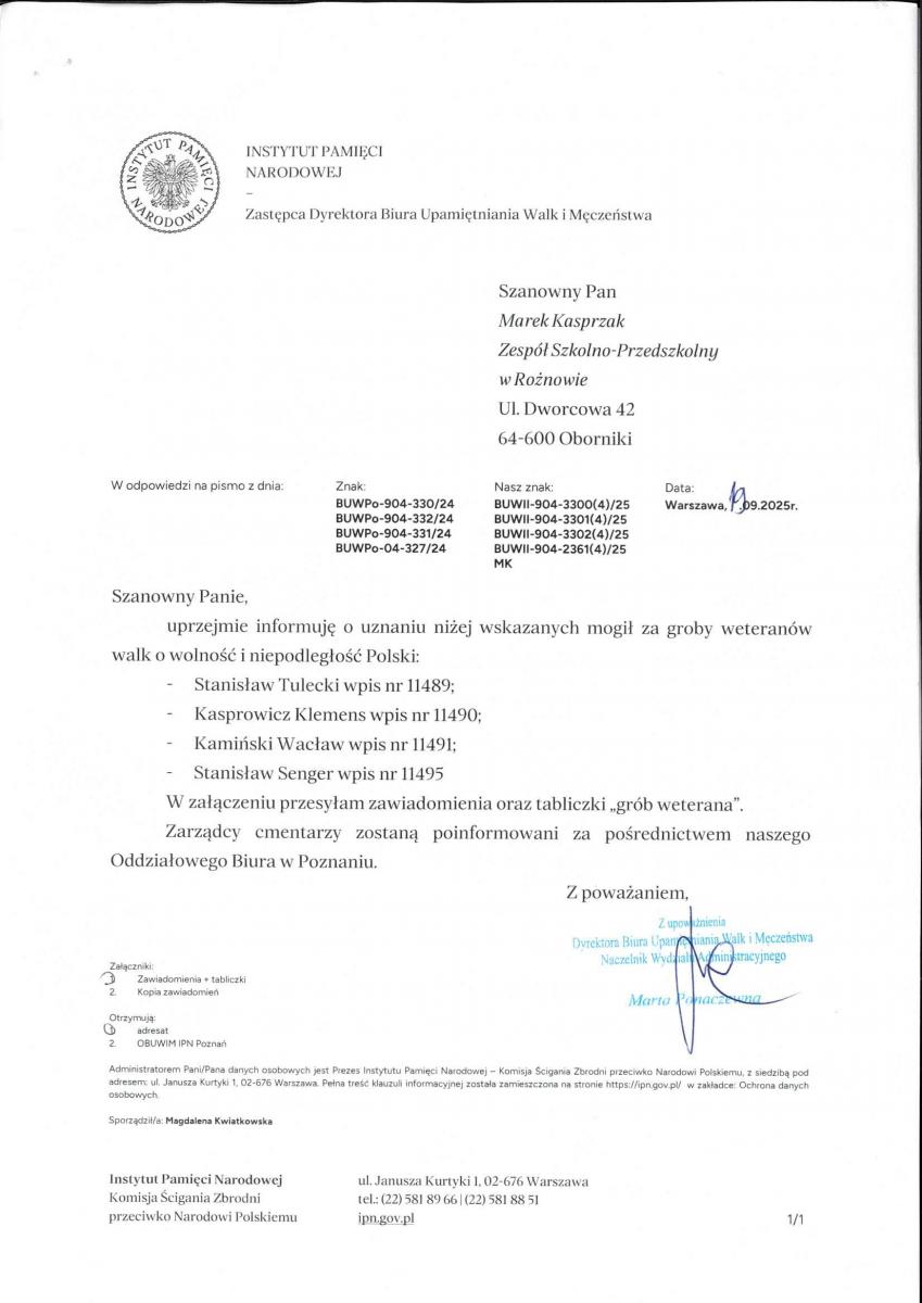 Groby czterech kolejnych lokalnych bohaterów zostały wpisane do ewidencji grobów weteranów walk o Wolność i Niepodległość Polski. Mogiły znajdują się na cmentarzach w Rożnowie, Białężynie i Obornikach.